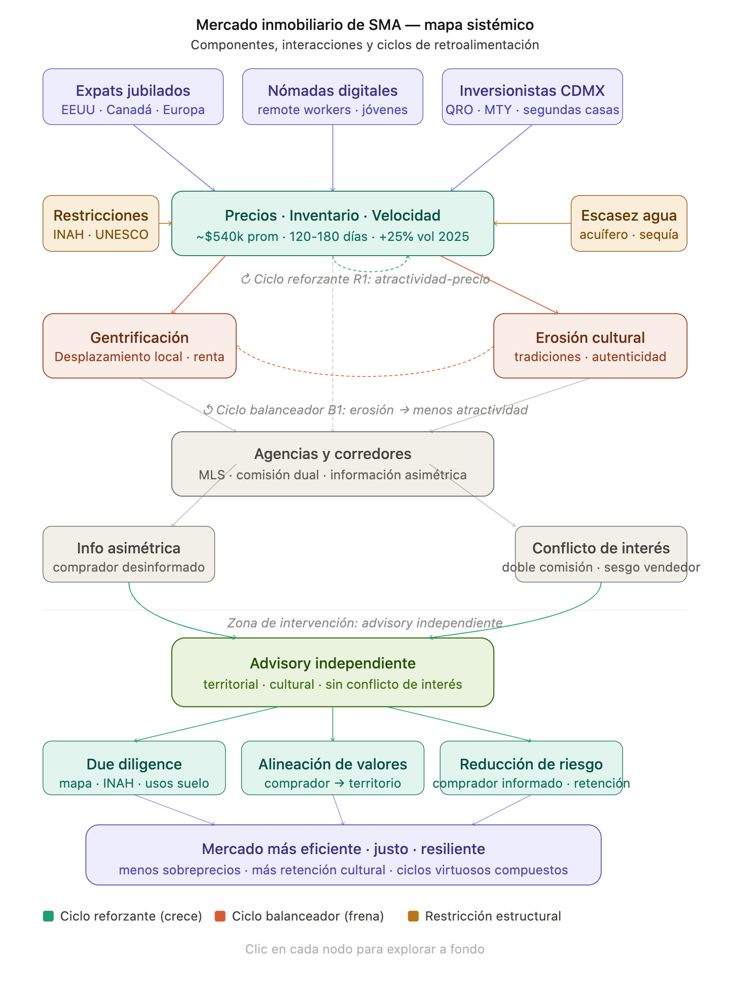 Esto no es solo un problema ético — es una amenaza sistémica al activo fundamental del mercado. La gentrificación ha generado "rentas exorbitantes, segregación y desplazamiento laboral hacia las periferias de la ciudad, donde muchas áreas carecen de servicios básicos, infraestructura y seguridad." Si la autenticidad cultural que hace a SMA deseable para los compradores se erosiona, el sistema pierde su diferenciador irreproducible. Ese es el ciclo balanceador B1: la erosión cultural eventualmente limita la atractividad, frenando la espiral de precios — pero de la manera más costosa posible.
